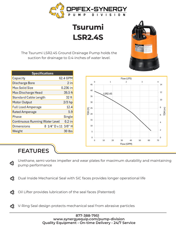 | Description | The Tsurumi LSR2.4S Ground Drainage Pump holds the suction for drainage to 0.4-inches of water level. |